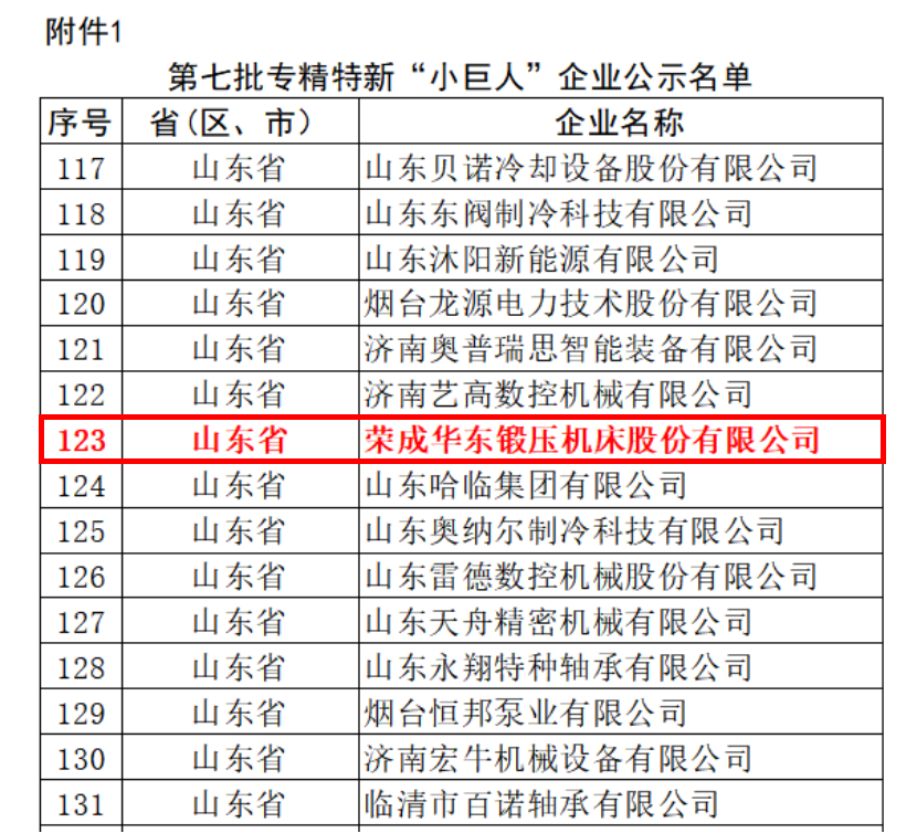 近日,山東省工業(yè)和信息化廳公布《關(guān)于山東省第七批專精特新”小巨人”企業(yè)名單公示》,榮成華東鍛壓機床股份有限公司憑借其在金屬成形機床高端裝備領(lǐng)域突出的創(chuàng)新能力、技術(shù)實力和市場地位,成功入選。這一國家級榮譽的獲得,標志著榮成華東鍛壓機床股份有限公司在專業(yè)化、精細化、特色化、新穎化的發(fā)展道路上取得里程碑式的成就。